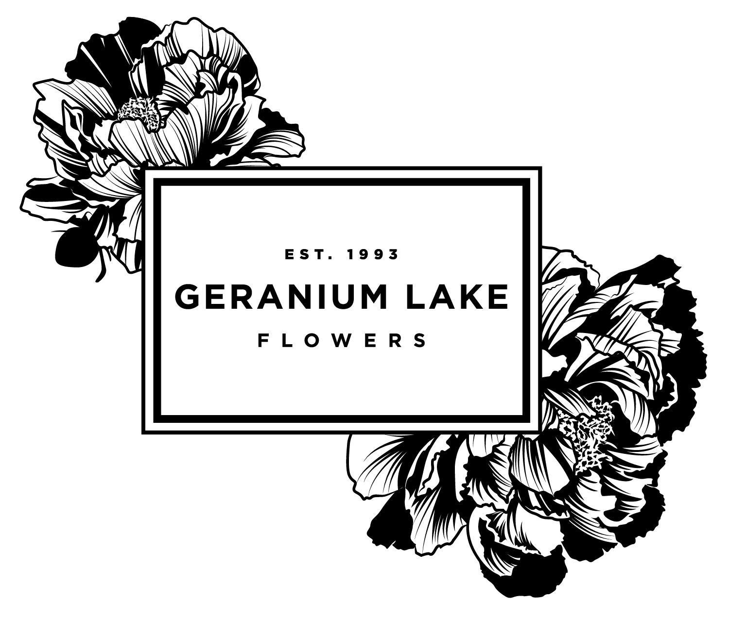 The final Geranium Lake Flowers logo balances personality with versatility. The owner wanted to retain the established name for its brand recognition while incorporating her love of peonies, so an illustrated floral mark was developed to immediately signal the nature of the business and evoke a handcrafted aesthetic. The detailed peony lockup serves as the expressive primary logo, while a simplified typographic version without the illustration provides flexibility for smaller or more restrained applications. The system also includes black and reversed-white variations to ensure the brand remains clear and elegant across different backgrounds and uses.